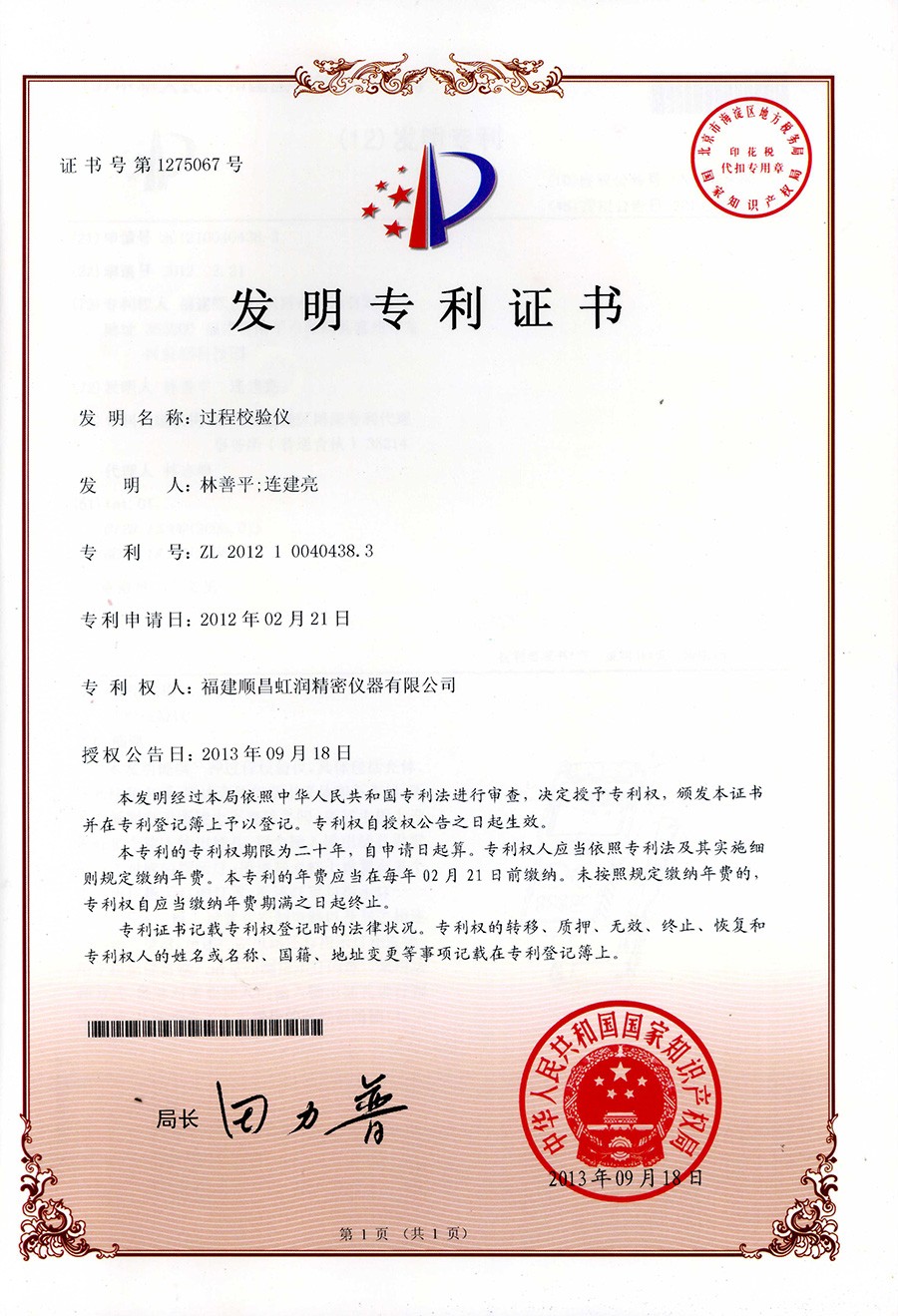 過程校驗儀發明 發明專利證 |
