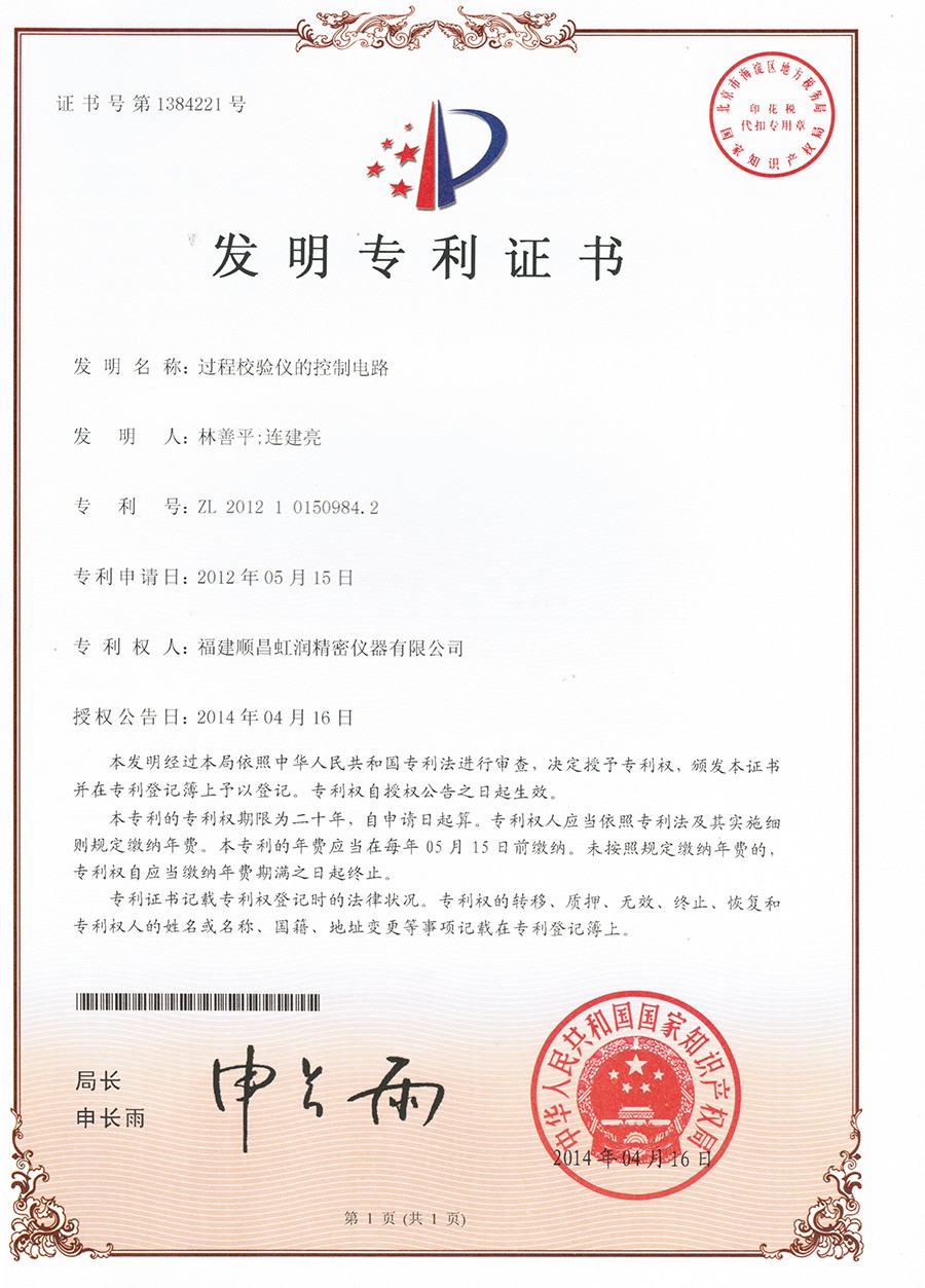 過程校驗儀的控制電路 發明專利證書 |